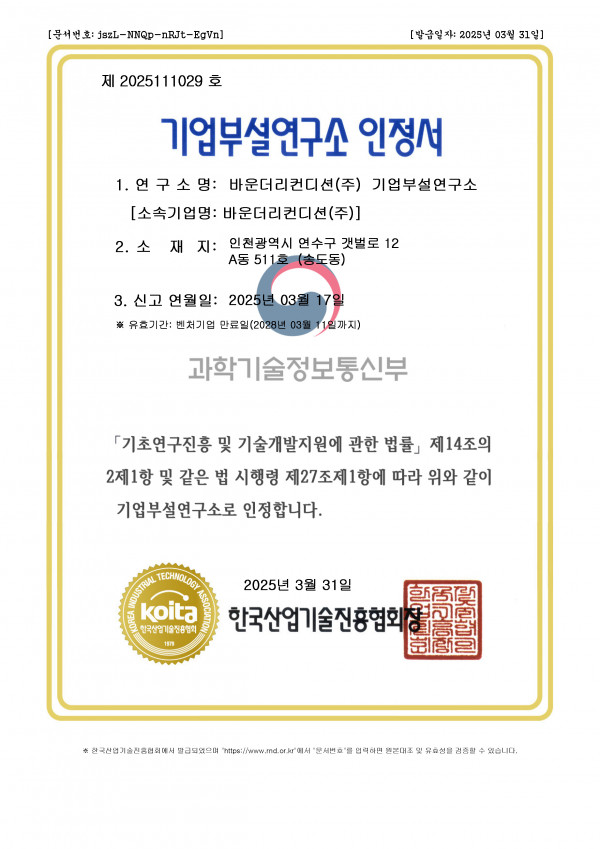 기업부설연구소 인정서 페이지 정보 작성자 바컨 댓글 0건 조회 165회 작성일 25-12-05 11:21 본문 . 목록 이전글 품질경영시스템 인증서 다음글 벤처기업확인서 댓글목록 댓글목록 등록된 댓글이 없습니다.